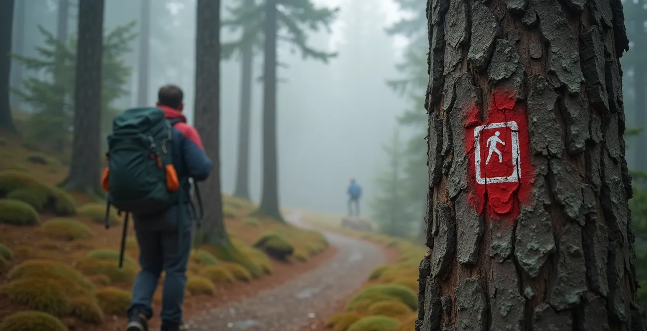 Cependant, toutes les marques rouges et blanches ne se valent pas. Il est crucial de ne pas les confondre avec les marques forestières, souvent une simple bande rouge ou blanche, qui délimitent des parcelles de bois et peuvent vous entraîner hors du chemin. Le vrai balisage CAI est un rectangle tricolore (rouge-blanc-rouge), souvent avec le numéro du sentier peint en noir au centre. Sur le terrain, l’espacement de ces marques est aussi un indice : sur un sentier facile, vous en verrez une tous les 200 à 300 mètres, tandis que dans une section complexe ou une forêt dense, elles seront bien plus rapprochées pour ne jamais vous laisser dans le doute.